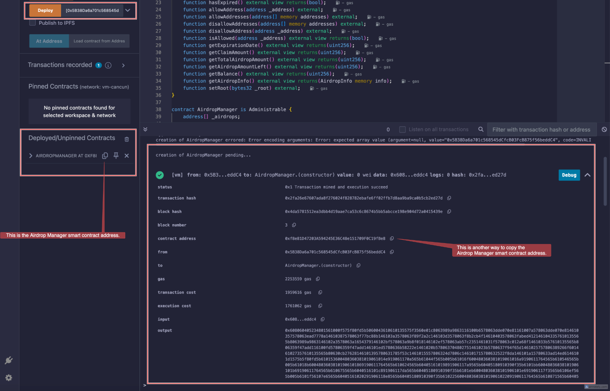 • Once deployment is successful, copy the contract address of the deployed AirdropManager.